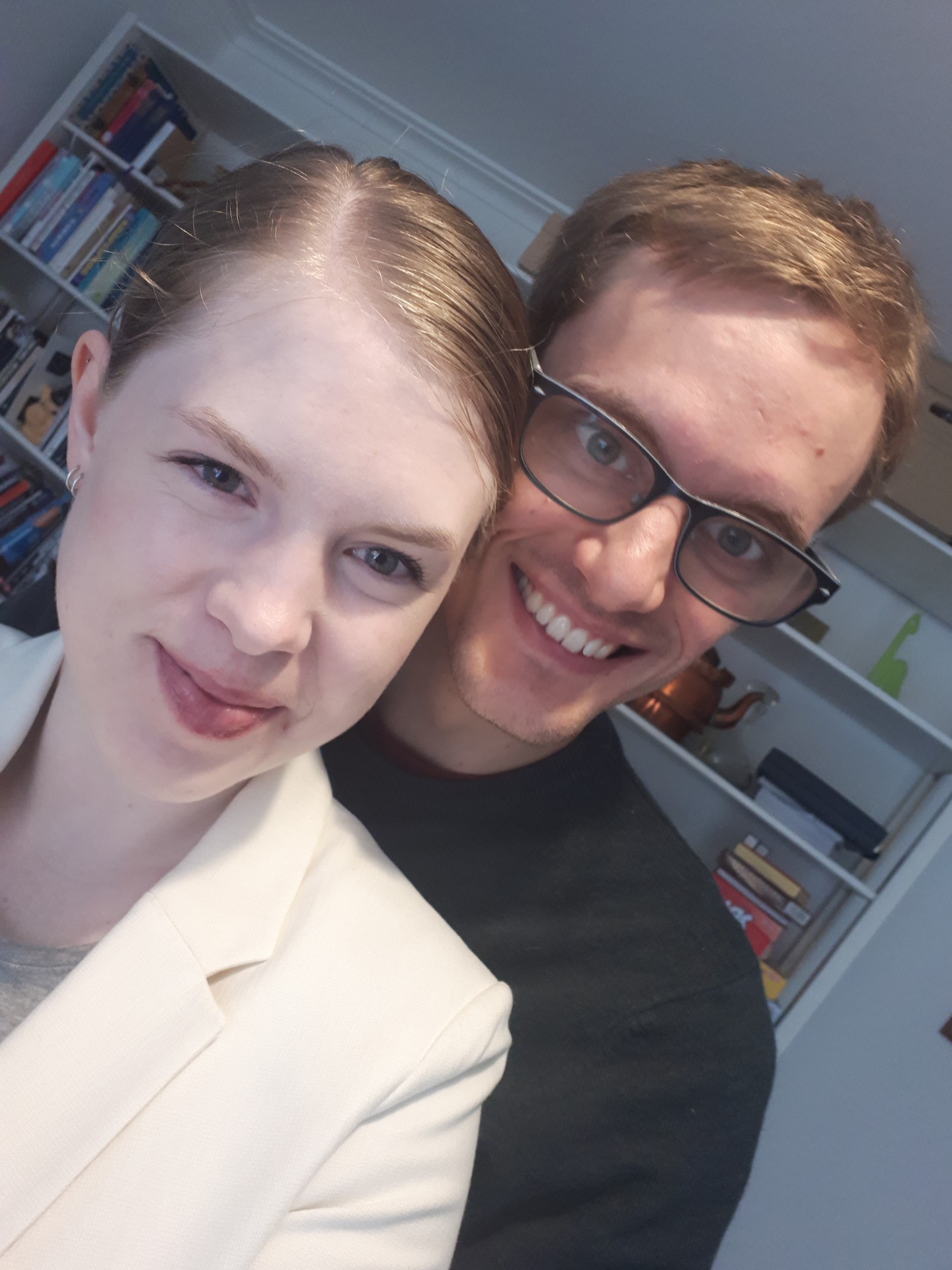 18. feb. 2019: Vi bliver forlovet, da Jonathan kl. 6:30 om morgenen går på knæ i stuen og frier til Marie (som er iført morgenkåbe og -hår).